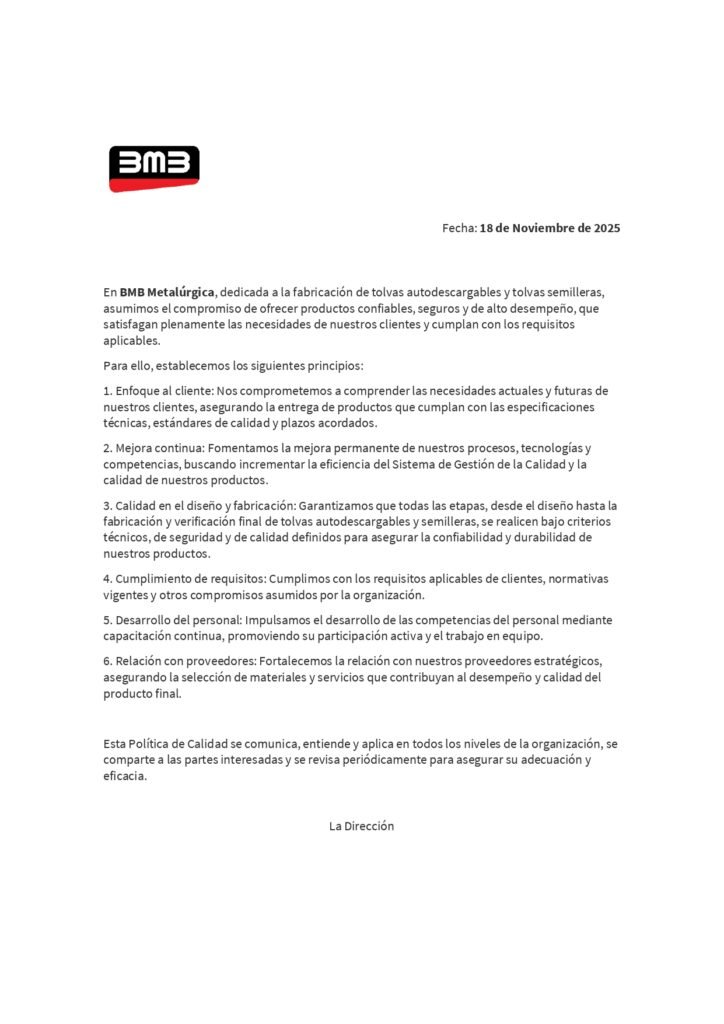 En BMB, no solo fabricamos implementos agrícolas, sino que creamos soluciones para el productor. Nos diferenciamos por nuestro compromiso inquebrantable con la calidad, la resistencia y la eficiencia, garantizando que cada equipo supere las expectativas del usuario.